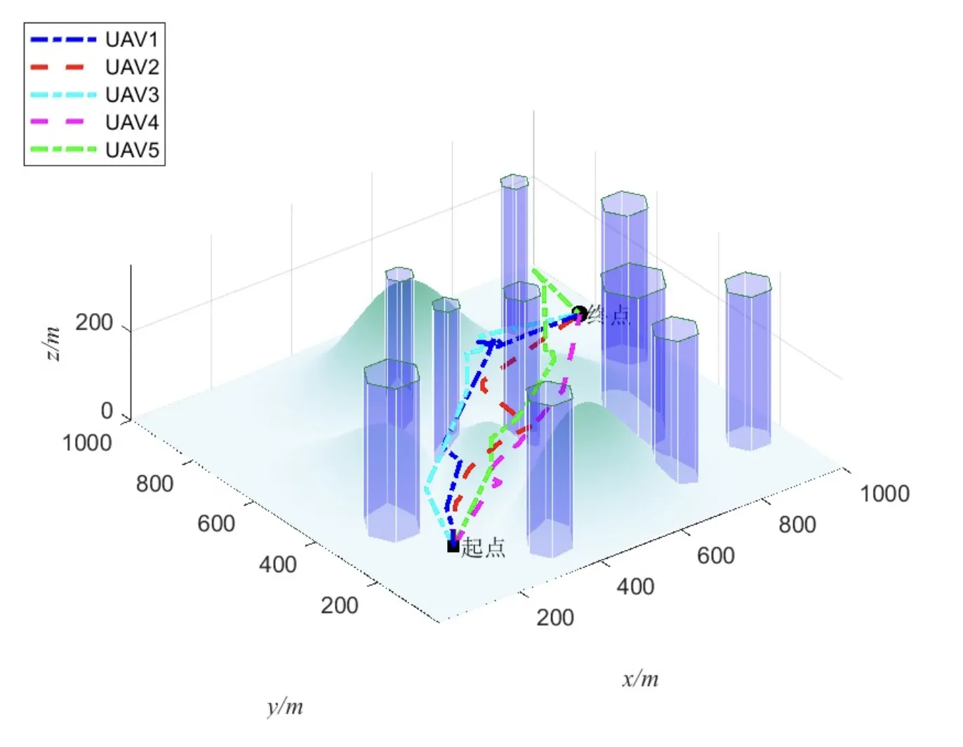 - 种群编码:每个个体包含所有无人机的路径点坐标,例如5架无人机的路径可表示为x=[x1,y1,z1,...,x5,y5,z5]。