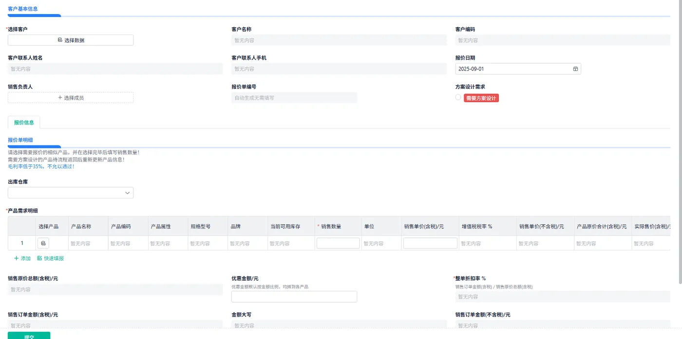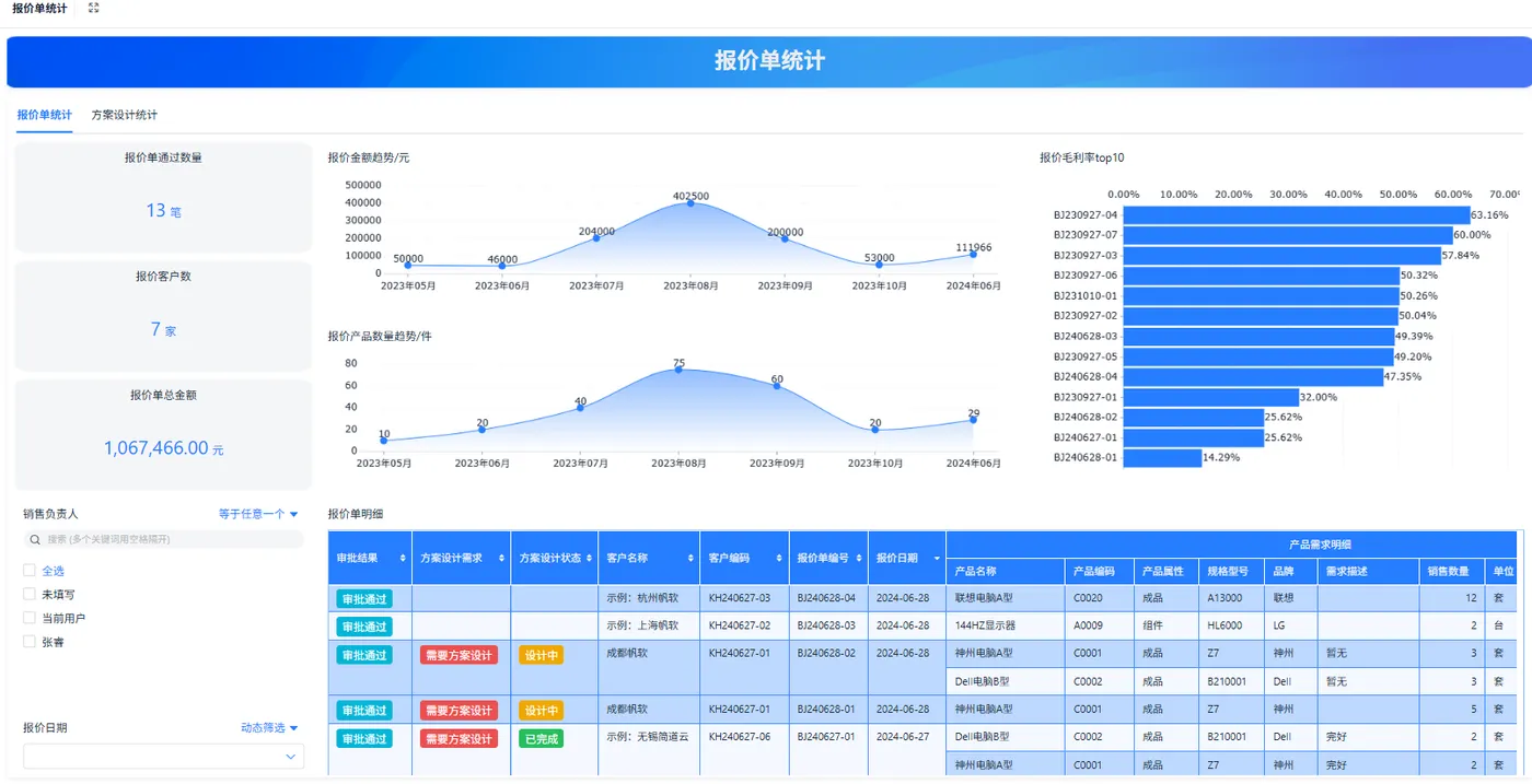 - 报价统计:报价量、通过率(成交率)、平均折扣、平均报价响应时间、报价毛利估算。