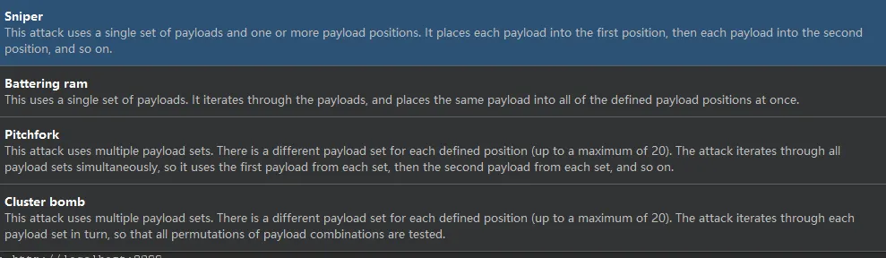- Cluster bomb:(字典交集爆破,适用于账号密码都不知道)