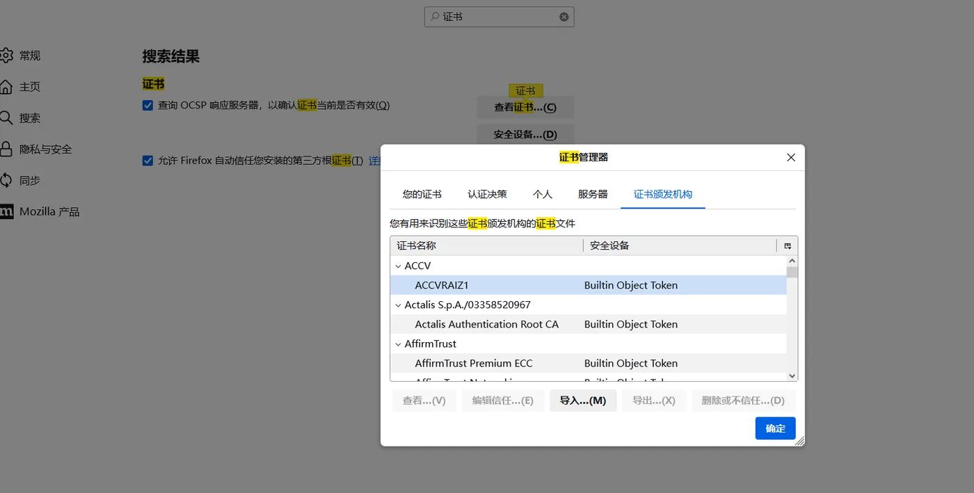 - 浏览器》设置》搜索证书》点击查看证书》导入下载的CA证书后》重启浏览器