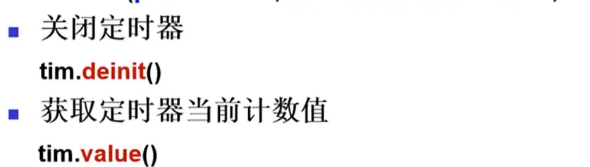 # 待验证 from machine import Timer tim=Timer(-1) result =0 def Service_T(tim): global reuslt result =result+1 print('当前秒数:',reuslt) tim.deinit() tim.init(period=1000,mode=Timer.PERIODIC,callback=Service_T)