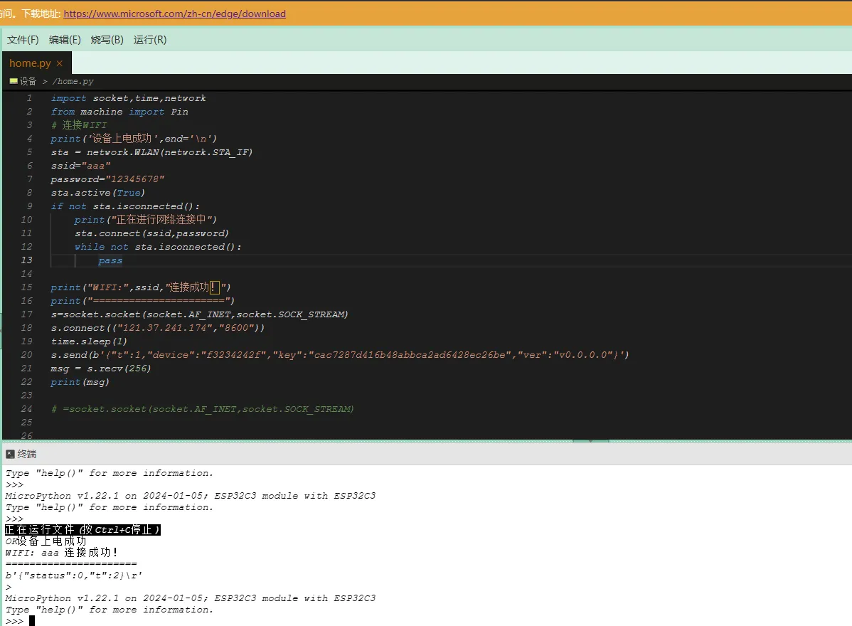 import socket,time,network from machine import Pin # 连接WIFI print('设备上电成功',end='\n') sta = network.WLAN(network.STA_IF) ssid="aaa" password="12345678" sta.active(True) if not sta.isconnected(): print("正在进行网络连接中") sta.connect(ssid,password) while not sta.isconnected(): pass print("WIFI:",ssid,"连接成功!") print("======================") # socket 连接并发送心跳包 s=socket.socket(socket.AF_INET,socket.SOCK_STREAM) s.connect(("121.37.241.174","8600")) time.sleep(1) s.send(b'{"t":1,"device":"f3234242f","key":"cac7287d416b48abbca2ad6428ec26be","ver":"v0.0.0.0"}') msg = s.recv(256) print(msg) # =socket.socket(socket.AF_INET,socket.SOCK_STREAM) # 返回结果: b'{"status":0,"t":2}\r'
