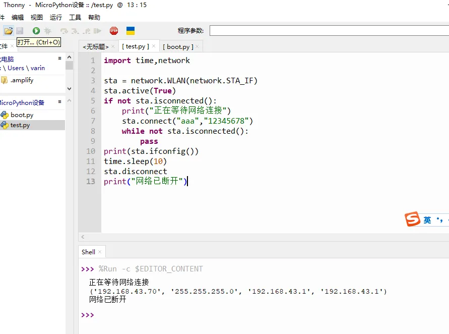 import time,network sta = network.WLAN(network.STA_IP) sta.active(True) if not sta.isconnected(): print("正在等待网络连接") sta.connect("aaa","12345678") while not sta.isconnected(): pass print(sta.ifconfig()) time.sleep(10) sta.disconnect print("网络已断开")