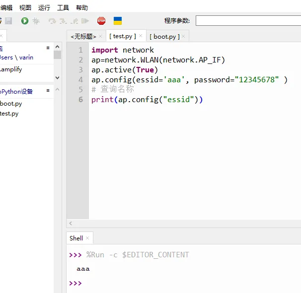 # 设置连接WIFI热点的名称、密码、信道 ap.config(essid='名称',password="密码",channel=1) # 读取热点名称 # 例 import network ap=network.WLAN(network.AP_IF) ap.active(True) ap.config(essid='aaa', password="12345678" ) # 查询名称 print(ap.config("essid"))