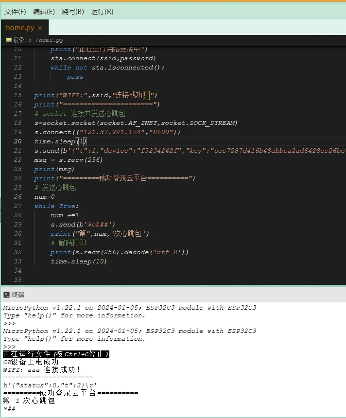 import socket,time,network from machine import Pin # 连接WIFI print('设备上电成功',end='\n') sta = network.WLAN(network.STA_IF) ssid="aaa" password="12345678" sta.active(True) if not sta.isconnected(): print("正在进行网络连接中") sta.connect(ssid,password) while not sta.isconnected(): pass print("WIFI:",ssid,"连接成功!") print("======================") # socket 连接并发送心跳包 s=socket.socket(socket.AF_INET,socket.SOCK_STREAM) s.connect(("121.37.241.174","8600")) time.sleep(1) s.send(b'{"t":1,"device":"f3234242f","key":"cac7287d416b48abbca2ad6428ec26be","ver":"v0.0.0.0"}') msg = s.recv(256) print(msg) print("=========成功登录云平台==========") # 发送心跳包 num=0 while True: num +=1 s.send(b'$ok##') print("第",num,'次心跳包') # 解码打印 print(s.recv(256).decode('utf-8')) time.sleep(10)
