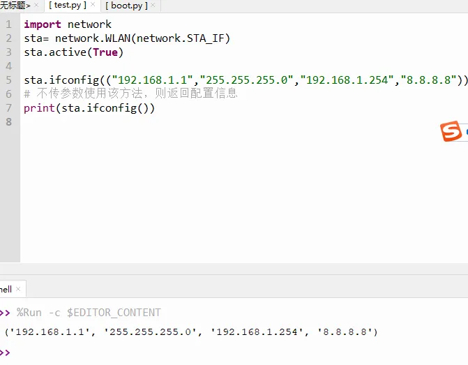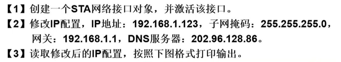#ifconfig方法的参数:一个元组 # 元组中有四个参数分别是:ip/子网掩码、网关、dns import network sta= network.WLAN(network.STA_IF) sta.active(True) sta.ifconfig(("192.168.1.1","255.255.255.0","192.168.1.254","8.8.8.8")) # 不传参数使用该方法,则返回配置信息 print(sta.ifconfig())