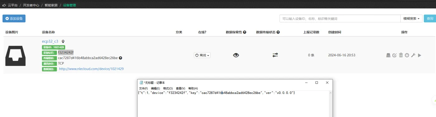 # device :为设备标识 # key: 为传输密钥 {"t":1,"device":"f3234242f","key":"cac7287d416b48abbca2ad6428ec26be","ver":"v0.0.0.0"}
