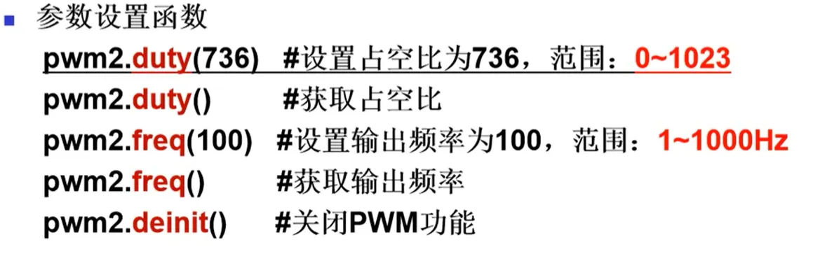 # 参数一:引脚 # 参数二:频率 # 参数三:占空比 pwm1=PWM(Pin(2,Pin.OUT),freq=500,drty=512)
