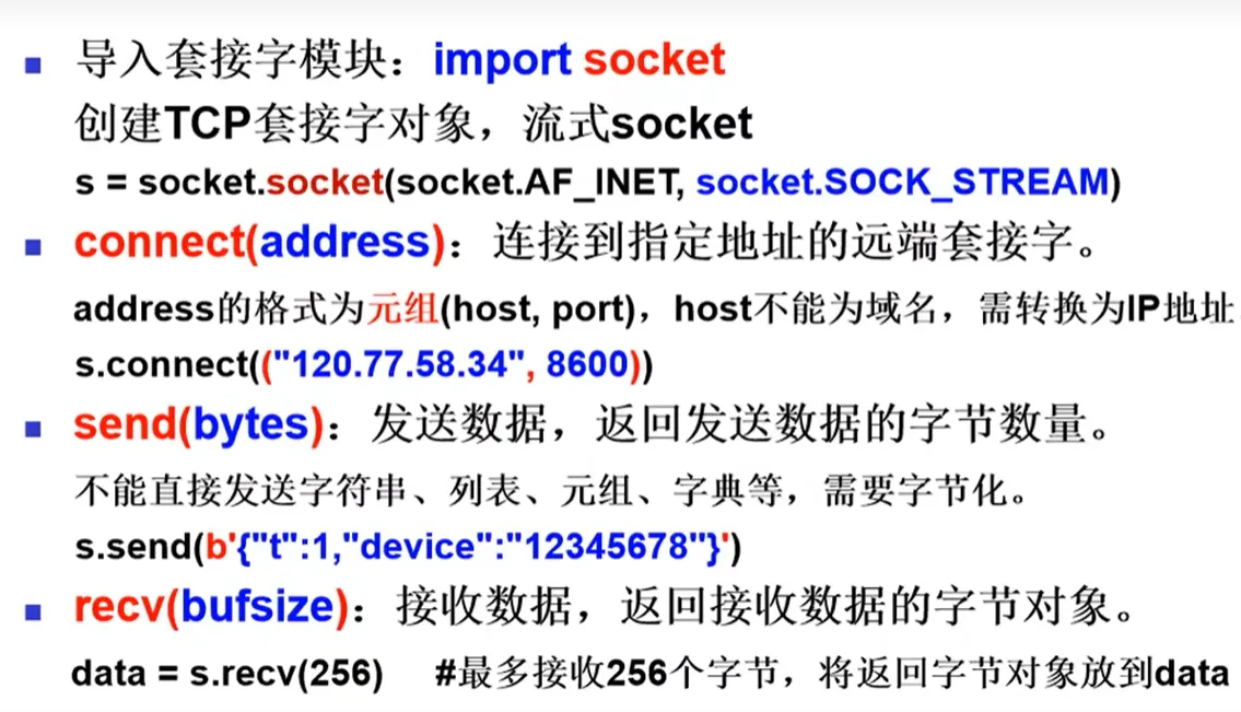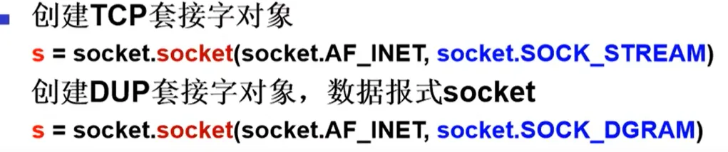 # 三个参数 # 参数一: socket_INET/socket_INET6 # 参数二: TCP:socket.SOCK_STREAM UDP: socket.SOCK_DGRAM # 参数三:可选 socket()