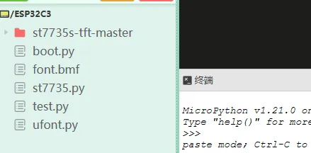 boot.py:用于连接WIFI,打印初始化信息等。 font.bmf: 文字库 st7735.py: ST7735驱动 test.py: 测试效果文件 ufont.py: 字体文件