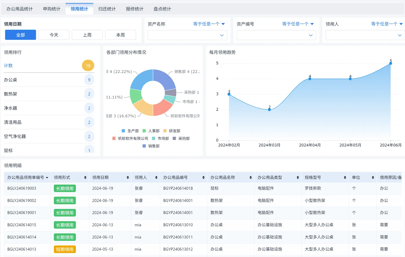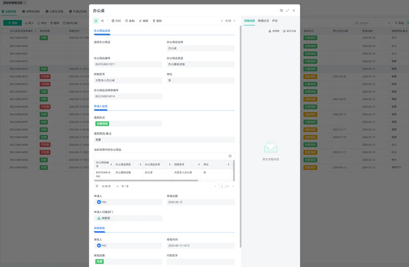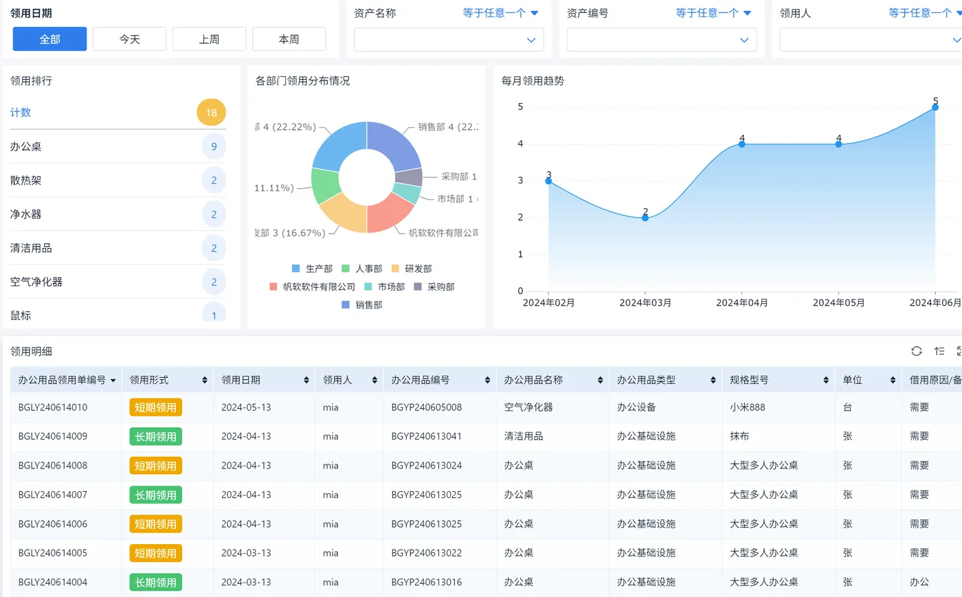 - 状态追踪:申请中、已审批、已领用。