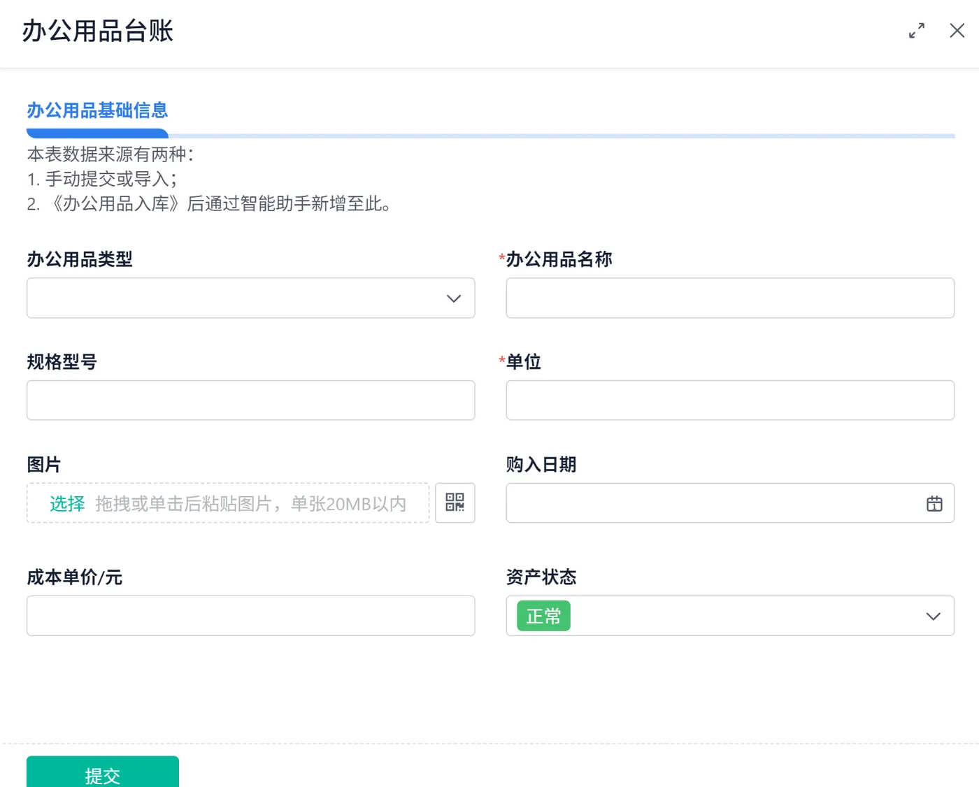 - 员工申请:谁要什么物资、数量多少、用途是什么。