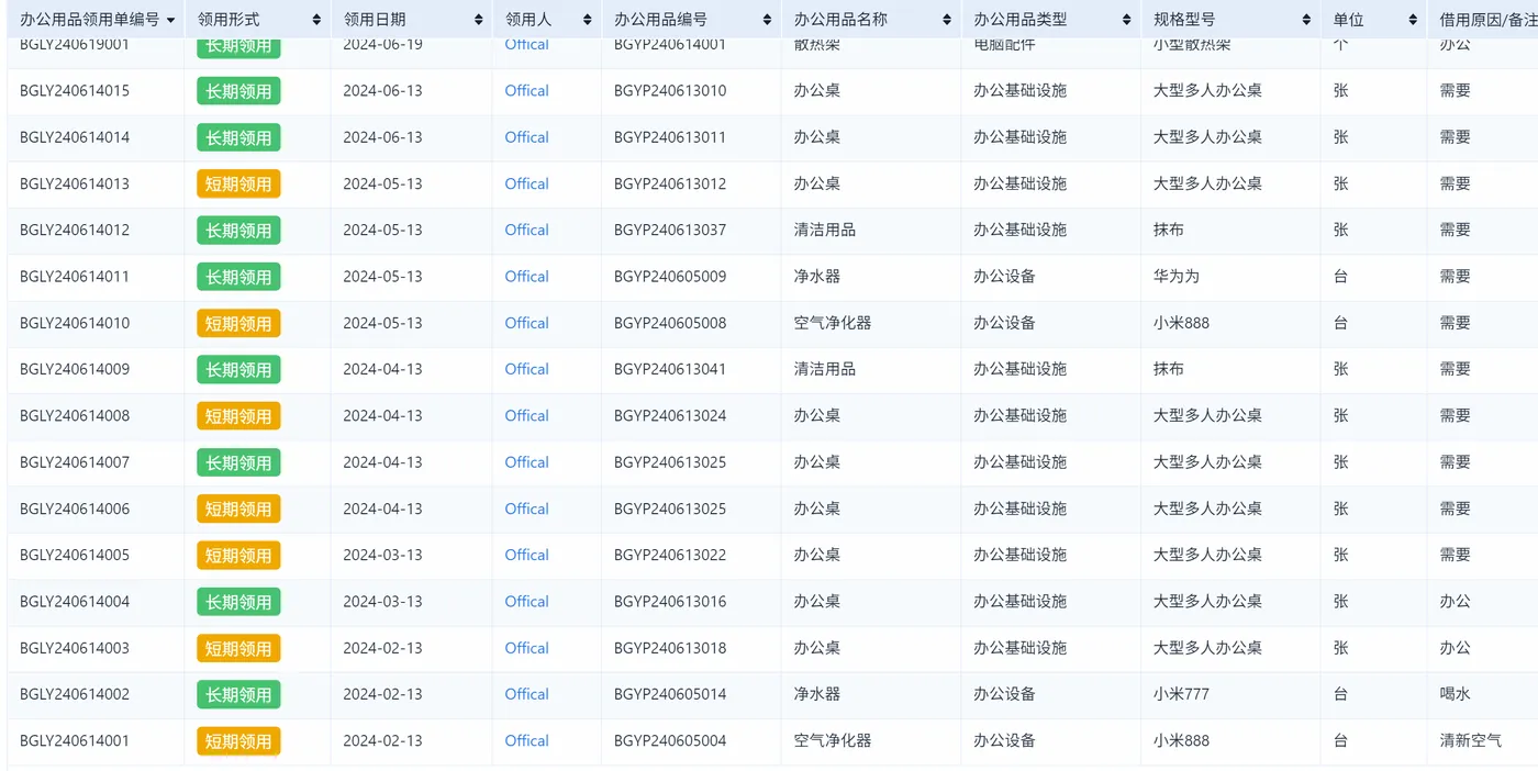- 库存实时透明:员工在申请时能看到库存,申请更理性,不会乱报。库管也能提前补货,避免断供。
