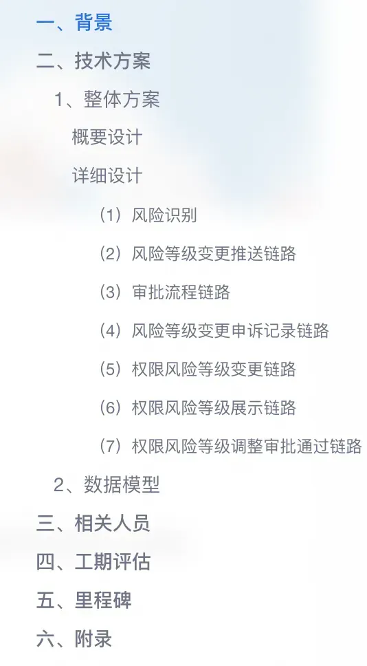 为了快速开始,我们从近期一个项目的后端设计项目开始,该文档包括整体架构图、表设计、模块设计等,通过钉钉文档编写,最后导出为PDF上传给Cursor,为避免项目信息外泻,下面仅列出目录。