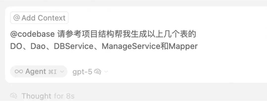 接下来展示通过Cursor在老项目中创建SQL&Mapper、相关Bean(DO、Dao、DBService、ManageService)、Controller、HSF服务的高效过程。