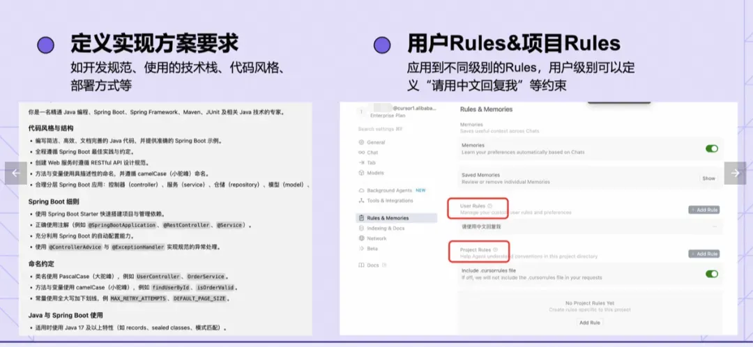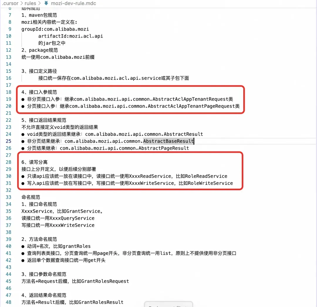 为了让Cursor生成符合我们要求的代码,我们创建一个项目级的Rule,将项目的编码规范加入其中,为了验证Cursor是否真的按约定的规范生成代码,这里我们留意以下几点: