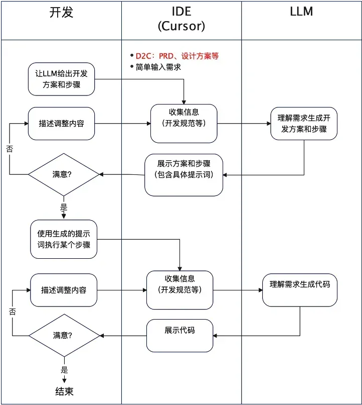 直接提供PRD或者相关资料给LLM,让LLM根据需要自己生成技术方案、开发步骤,这个过程也可以限制使用的技术框架等。