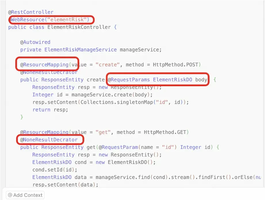 - 除此之外,Cursor还识别到了项目中经常使用@NoneResultDecrator这个注解,该注解是项目自定义的,用来告诉webx不要在返回结果外部再套一层json对象,直接返回方法返回的内容;