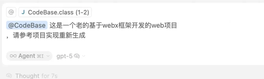 我们是webx的工程,因此使用@CodeBase 指令让Cursor参考现有项目结构和风格生成代码。