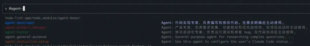 输入 @agent-可以召唤出可用的 Subagents 列表,界面选择合适的进行使用。