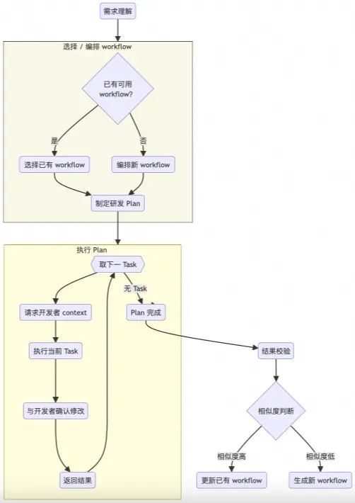 1.制定 Plan:整个工作流程始于对需求理解,基于此选择一个现有的工作流或重新进行编排,并依此制定详尽的研发计划。