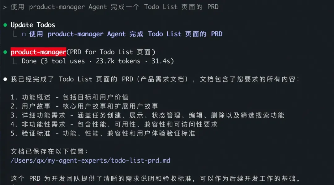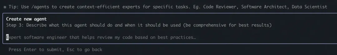按照提示添加 Agent 描述后就可以创建一个 Subagent 了