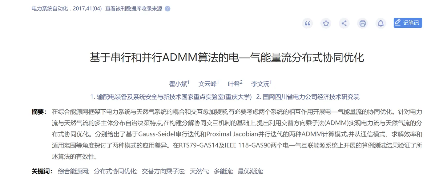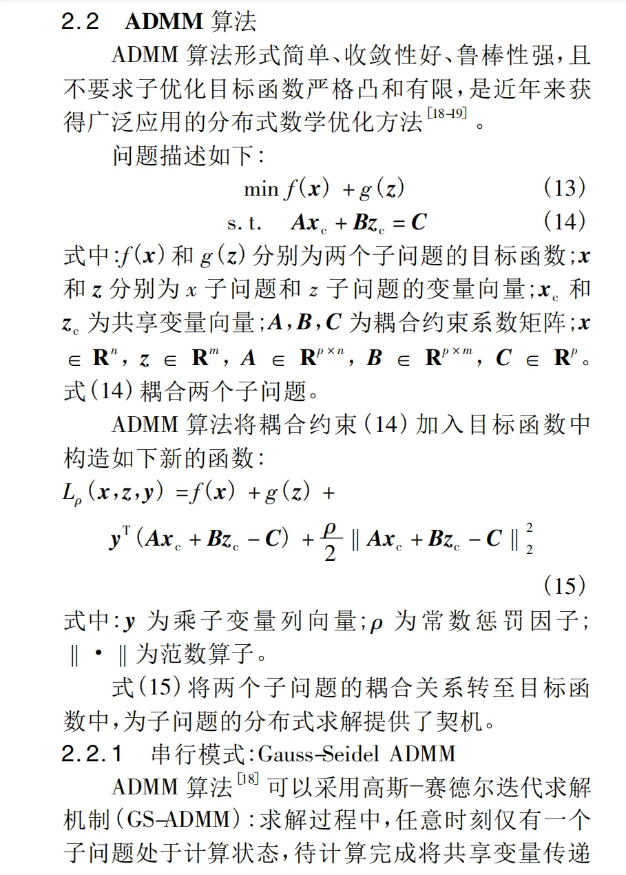 交替方向乘子法(Alternating Direction Method of Multipliers, ADMM)作为一种有效的分布式优化算法,近年来在电力系统领域得到了广泛应用。ADMM算法能够将复杂的大规模优化问题分解为多个小规模的子问题,这些子问题可以在分布式节点上并行求解,从而大大降低了计算复杂度,提高了计算效率。同时,ADMM算法通过引入乘子变量,能够有效地处理优化问题中的约束条件,使得求解结果更加准确和可靠。