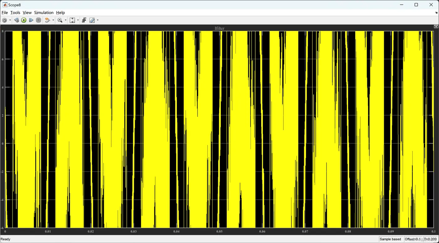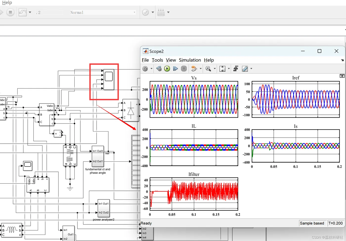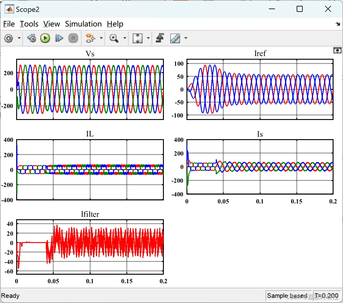 并联有源滤波器在0.08秒时切换。现在电源电流是正弦的,与电源电压同相。
