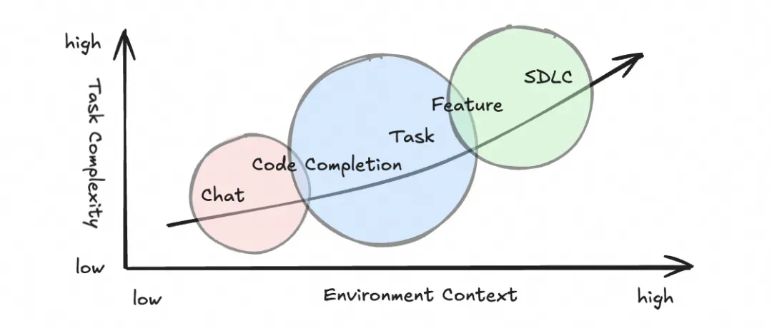 随着大语言模型技术的迭代升级,不断地促进 AI Coding 领域的快速发展。其应用的边界不断地拓宽,而 AI autonomous 的滑块快速地向右侧滑动。产品能力分别从代码辅助编写,对话式互动的工程修改和重构,再到委派 AI 自主编程的三个阶段进行演进。AI Coding 的能力覆盖的问题边界也从知识问答,到 feature 的端到端实现。