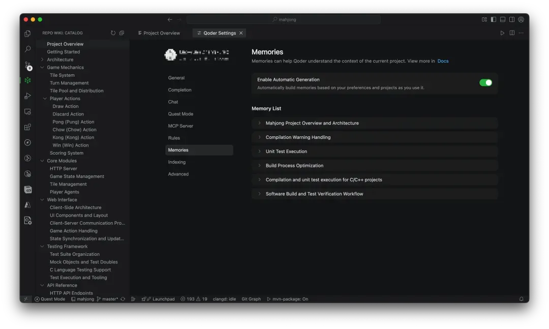 大部分的开发工作都是基于已有的代码工程,开发者在开始他的工作之前,总是希望能够快速理解这个工程是用来做什么的,具体的技术架构是什么。通过 Repo Wiki,可以让开发者快速了解这些信息。同时,我们也希望 Qoder 也能了解这些信息,Qoder 会在后台构建代码库的索引,并将工程引入到记忆中。这样,开发者在开始一个任务的时候,大部分知识都已经准备就绪,开发者不用手工选择太多的上下文信息,Qoder 也可以准确地帮助开发者来完成。