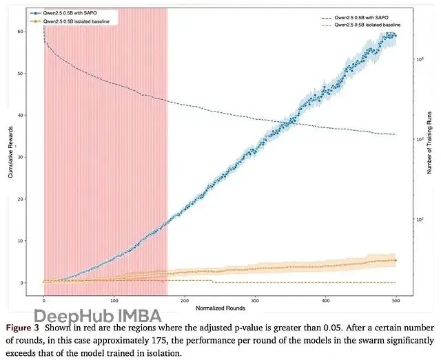 SAPO对中等规模模型的帮助更明显。比如Qwen2.5(0.5B参数),在175轮训练后的表现明显超过单机训练。但对于Qwen3(0.6B参数)这样的大模型,改善就不太明显了。