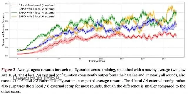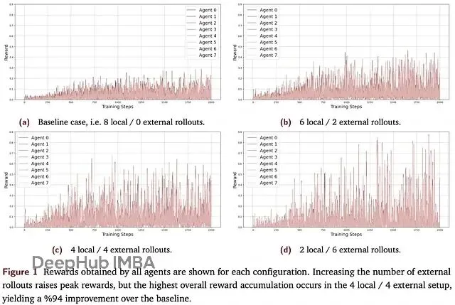 结果显示,4本地+4外部的配置效果最好,累计奖励最高,2/6和6/2的配置次之。和基线相比,4/4配置的提升幅度达到94%,而且在各个训练轮次中都能保持更高的平均奖励。