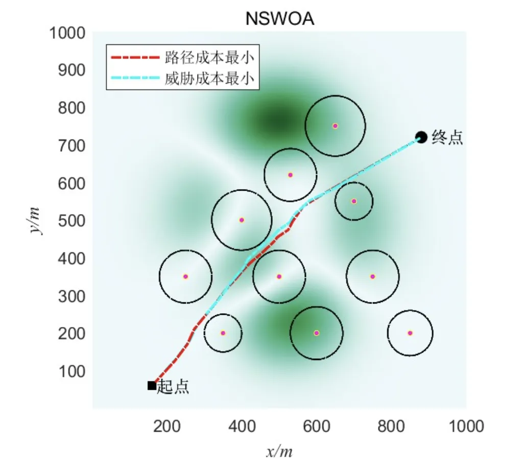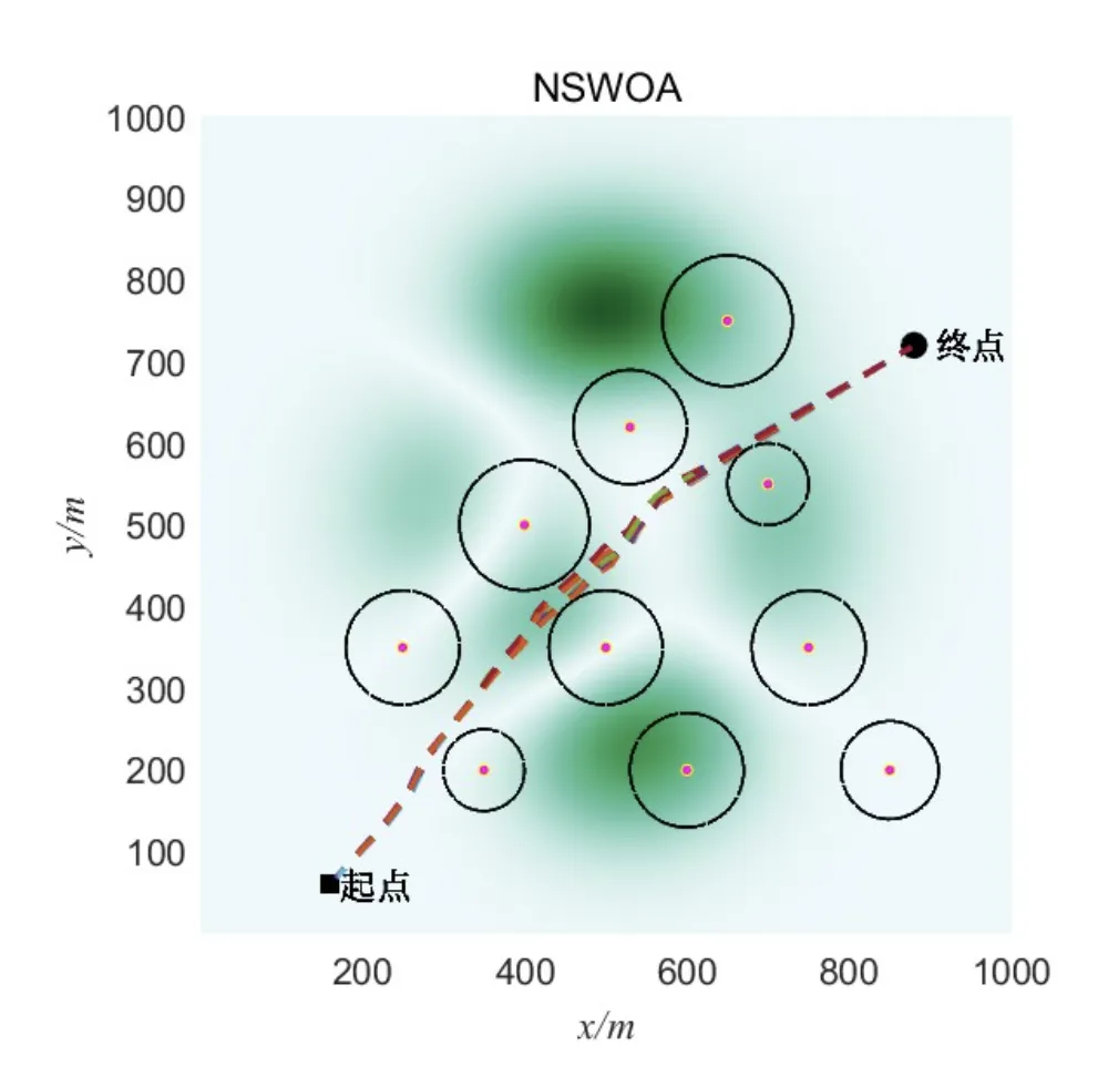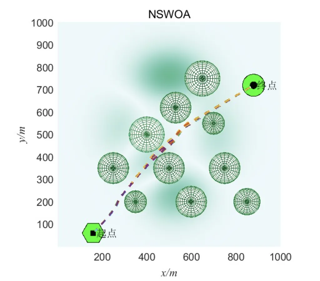 - NSWOA路径:优先选择直线距离较短的路径,飞行时间减少8%,但在障碍物边缘通过时安全性降低15%。