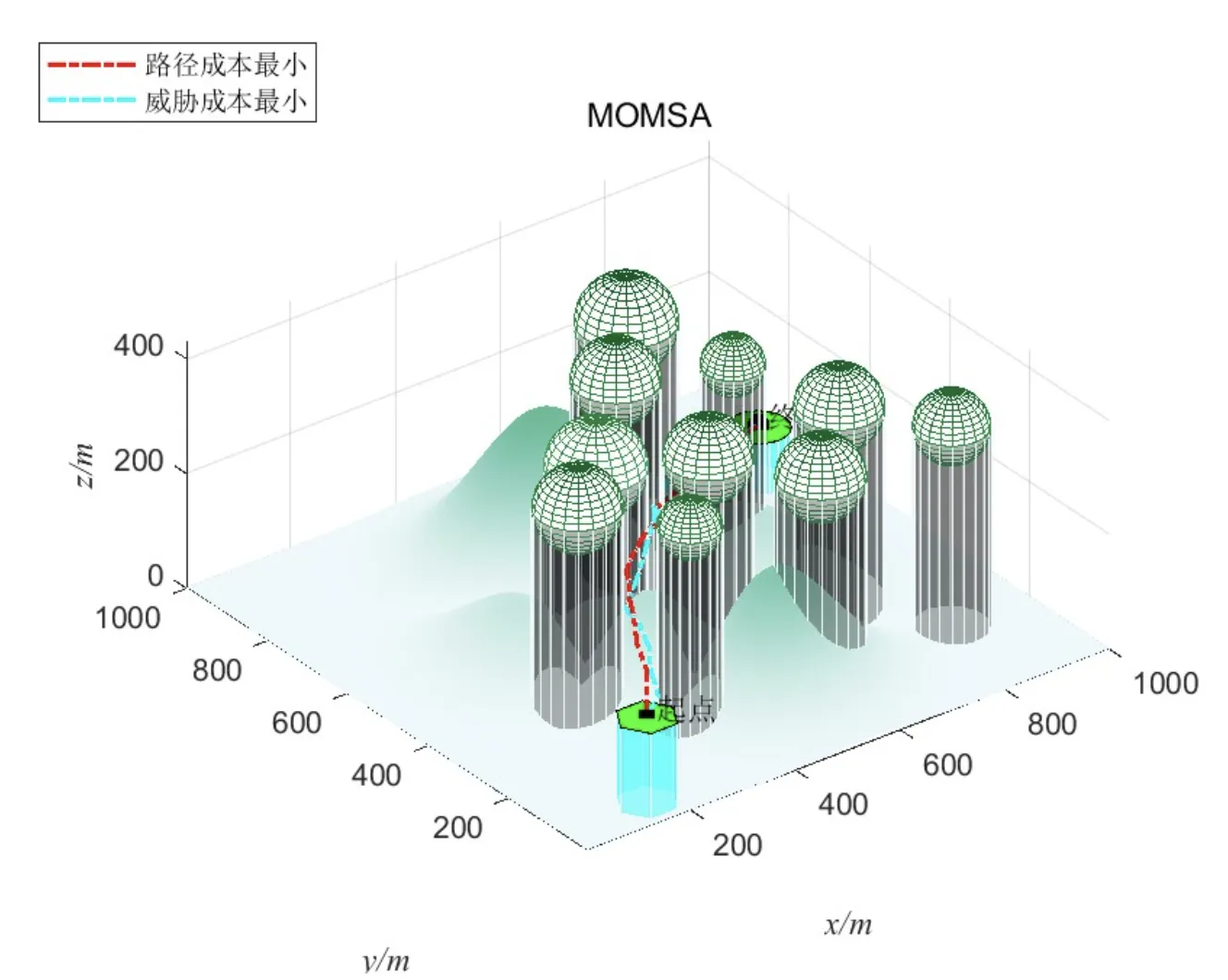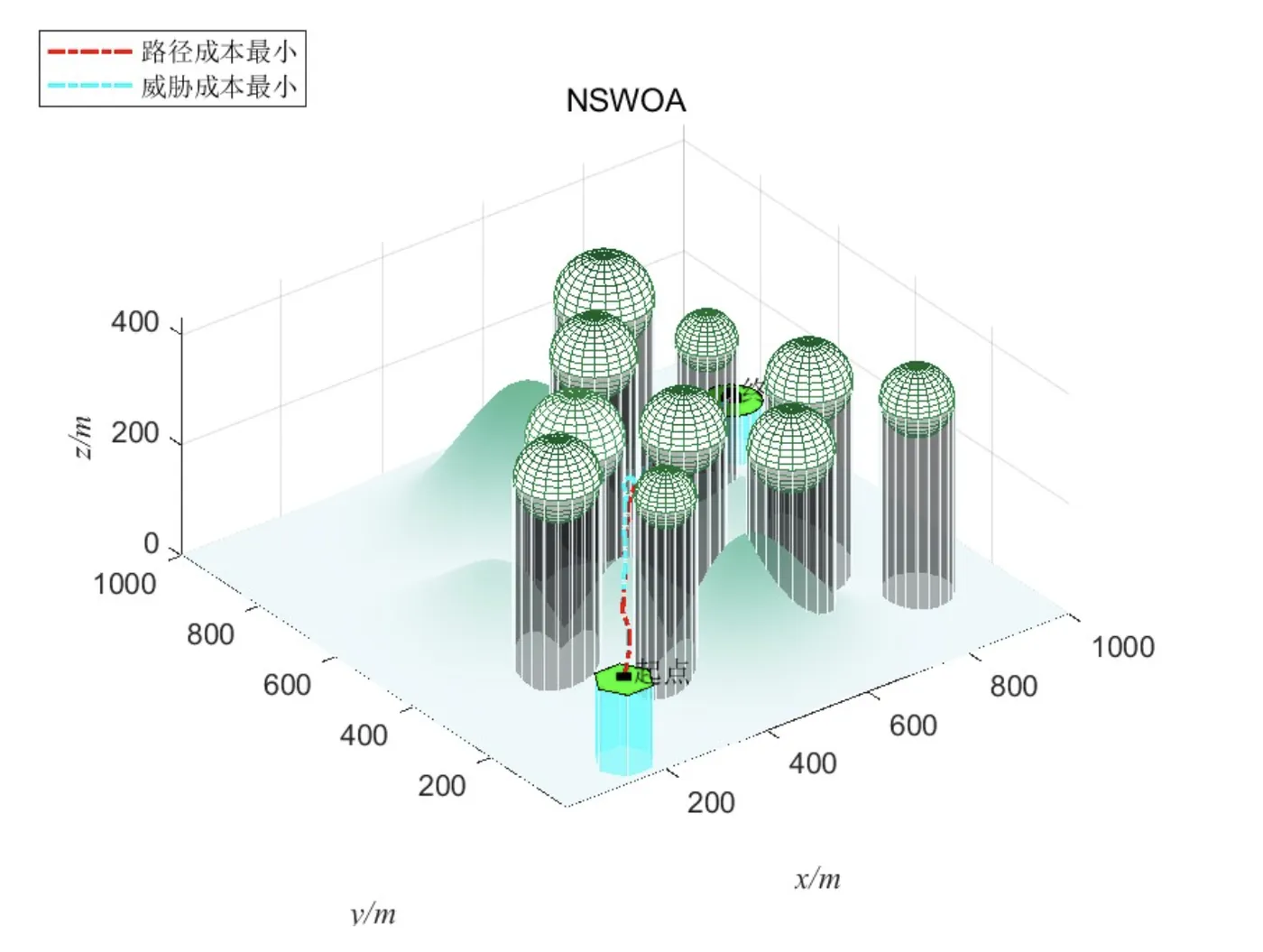 采用栅格地图表示三维空间,将仿真区域划分为多个立方体栅格。障碍物(如建筑物、山脉等)以圆柱体或长方体建模,其威胁成本函数定义为: