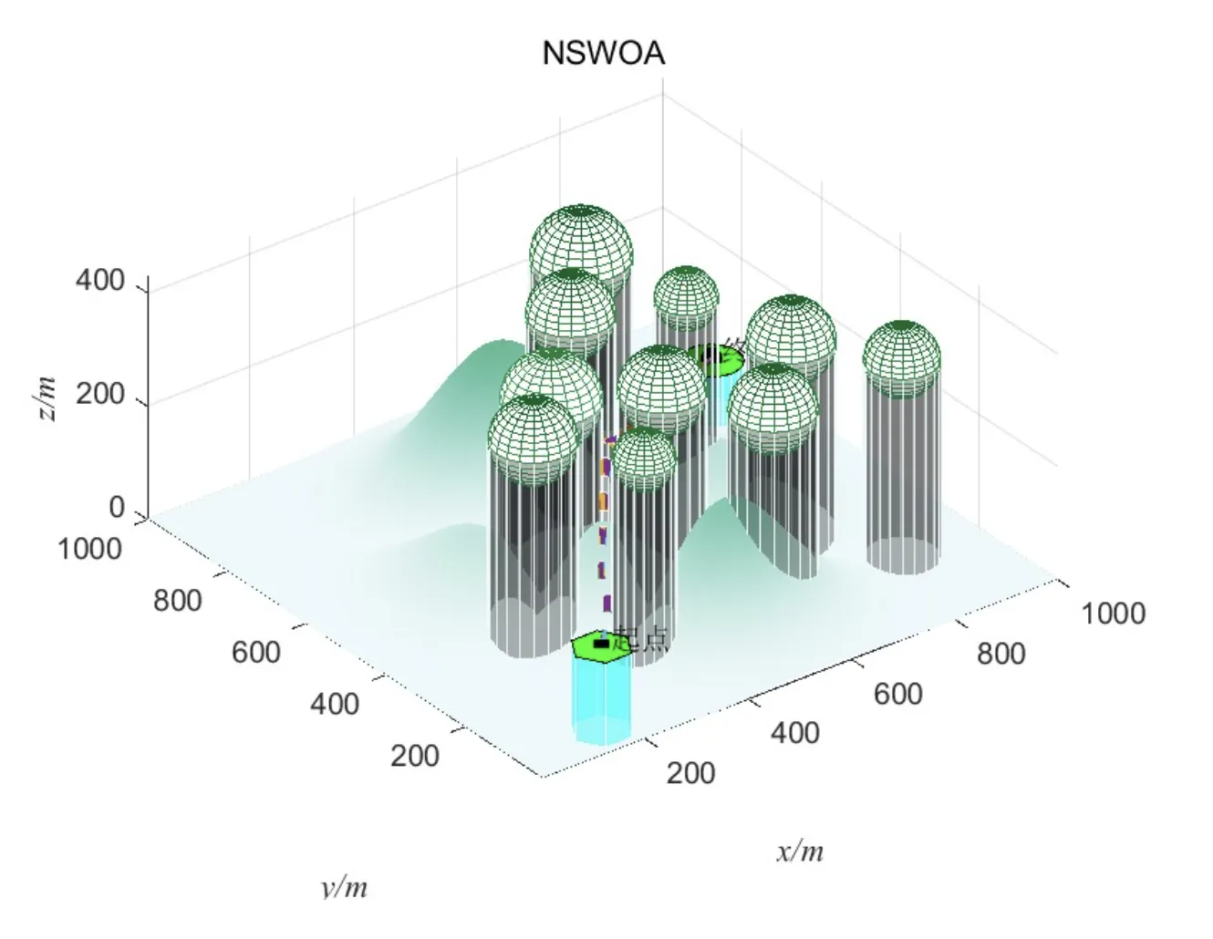 为了对比NSWOA和MOMSA算法在无人机三维路径规划中的性能,构建了一个包含复杂障碍物的三维仿真环境。仿真区域为1000m×1000m×500m,包含20个随机分布的障碍物。算法参数设置如下: