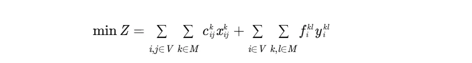 定义多式联运网络为有向图 G=(V,E),其中 V 为节点集合(含仓库、中转站、客户点),E 为边集合(含不同运输方式的路径)。目标函数为: