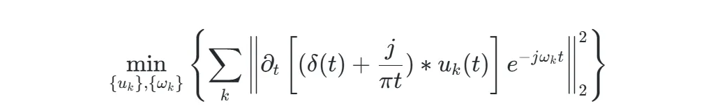 - 数学基础:将信号f(t)分解为KK个模态uk(t),目标是最小化各模态带宽之和,约束条件为∑uk(t)=f(t)。变分模型表达式为: