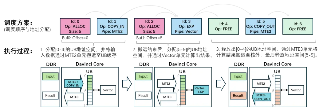 调度算法需要为计算图中每个数据缓冲区(即每个BufId)分配一个起始地址偏移(Offset),以确定其在硬件缓存中所占的位置。硬件上的各类缓存均为有限长度的连续地址空间,每个缓冲区需在指定缓存空间中占据一片连续的地址区间,其区间长度由Size字段指定。不同数据缓冲区可以分时复用同一片区间,但同一时刻存在的缓冲区,必须分配在不重叠地址区间。