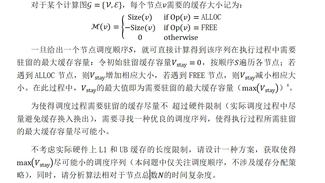 计算图为有向无环图(DAG),本题开始给出的图,其节点分为两类:在特定硬件单元上执行的操作节点,以及用于缓存资源分配的缓存管理节点。给定的一个计算图,需要通过调度算法提供一个包含计算图所有节点的有序列表作为调度顺序,以及为所有缓存管理节点中的申请节点分配相应类型的地址。在本核内调度问题中,处理核心由多个执行单元和多级缓存共同组成(参考附录A)。