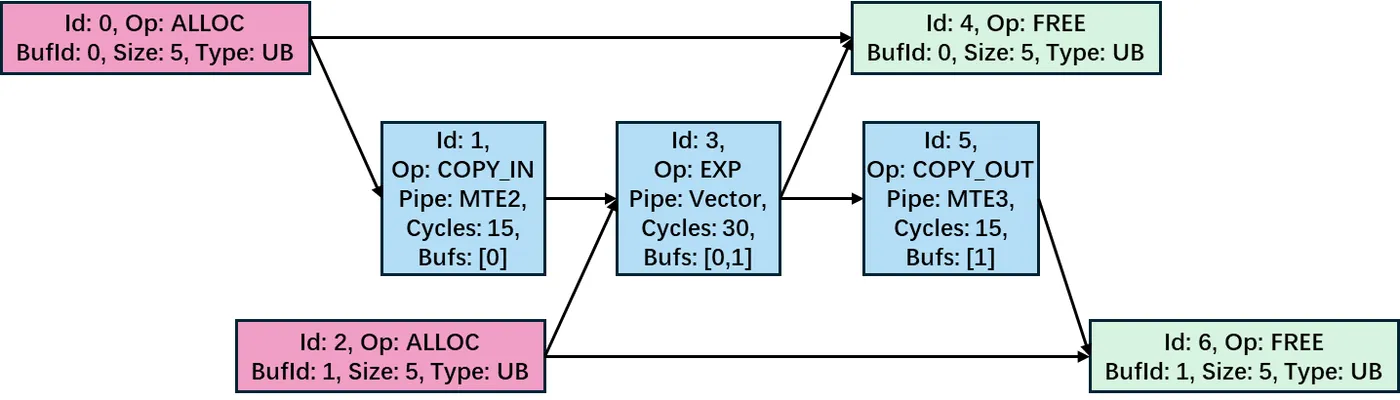 - 最后,ALLOC节点发出的有向边通常指向对应缓冲区数据的生产者(例如,Id为0的ALLOC节点指向COPY_IN节点);而该缓冲区内数据的消费者则通过有向边指向FREE节点(例如,EXP节点指向Id为4的FREE节点);生产者和消费者之间也通过有向边相连。