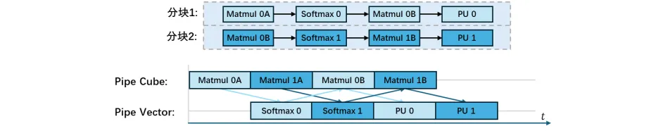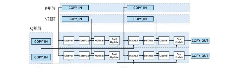 - 分块内部计算结构更为复杂:FA中的每个分块计算包含四个部分:Matmul、Softmax、Matmul和PostUpdate,每个部分均为一个结构较为复杂的子计算图(图中未展示细节)。其中,Matmul部分主要依靠Cube计算单元完成,而Softmax和 PostUpdate部分则主要依赖Vector计算单元实现。