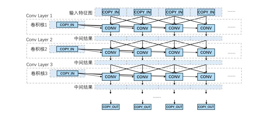 如图12所示,一个典型的多层卷积网络计算图以前端特征图载入缓存为起点,数据被切分为多个小块载入。每一卷积层由卷积核载入操作和多个卷积操作(CONV)构成,每个卷积操作的输入包括前一层输出的多个特征块与当前层的卷积核。输出结果继续流向后续卷积层作为输入,通过不断重复这一卷积过程,最终完成对整个输入数据的特征提取与推理。