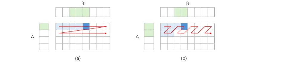 矩阵分块的计算顺序将直接影响额外数据搬运量。图9展示了两种计算顺序,(a)顺序按行计算