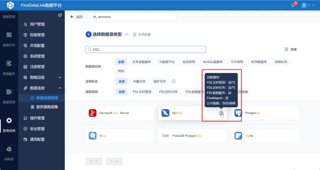 ETL工具擅长处理跨源数据整合与复杂逻辑转换,通过数据源支持与 SQL 算子能力,可以大大提升数据对比性能,实现多源系统数据的标准化与去重处理。我一般常用的数据集成与治理工具是FineDataLink(FDL),它提供了强大的多源接入能力,支持多种异构数据源,包括关系型数据库、非关系型数据库、API接口等,通过可视化界面和向导式的配置流程,用户可以轻松配置和管理这些数据连接。