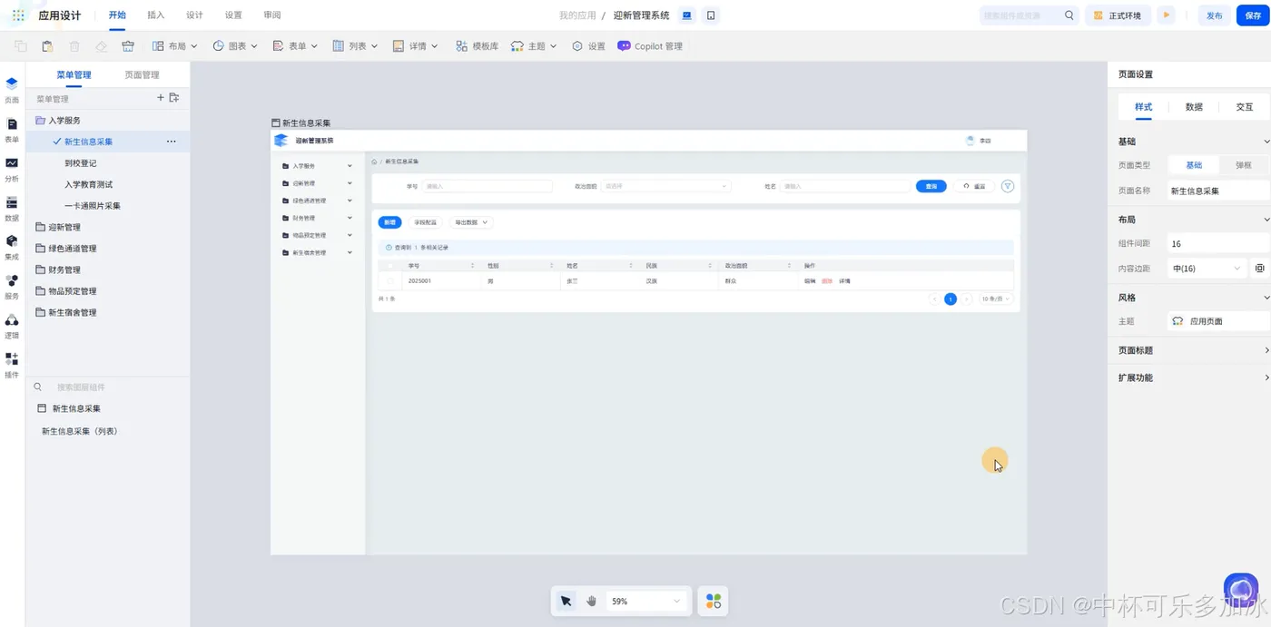 生成应用时,建议勾选 “携带测试数据” 这个选项 —— 它不是随便填的假数据,而是会模拟真实新生信息的格式,等下预览的时候,能更直观看到系统实际跑起来的效果,不用自己再手动造数据。勾选完成后点击 “应用” 按钮,就直接跳转到应用配置界面。