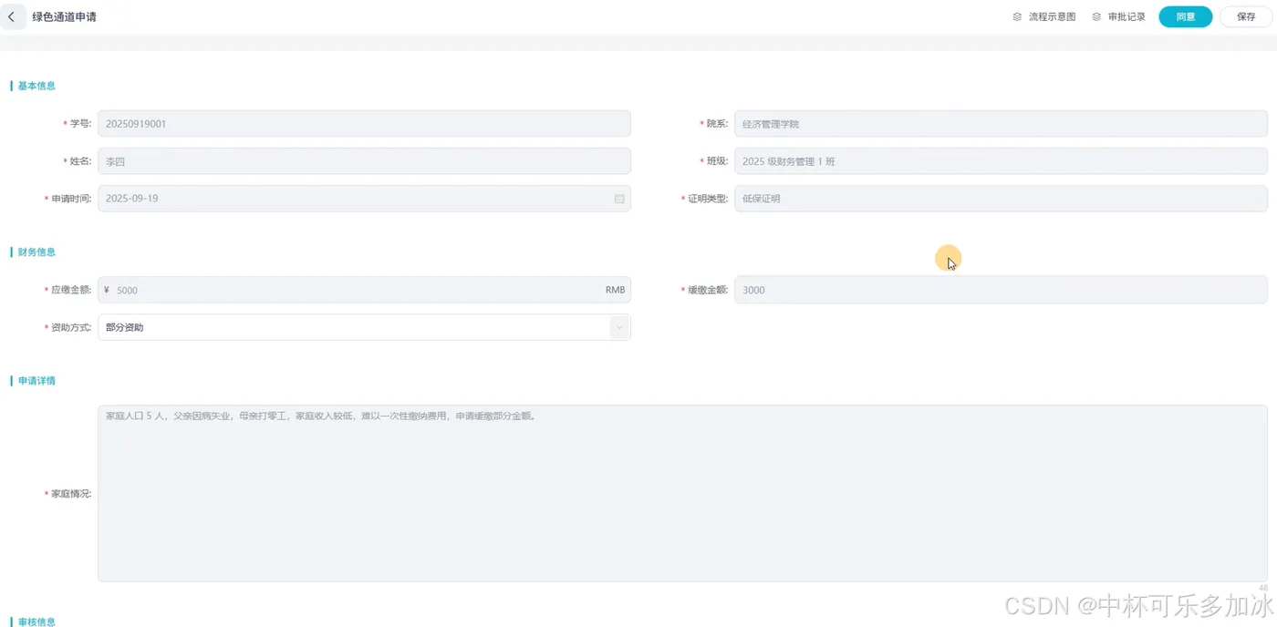 再切换到校级管理员账号,登录后进行审批,选了 “部分资助” 的资助方式,填完终审意见提交;