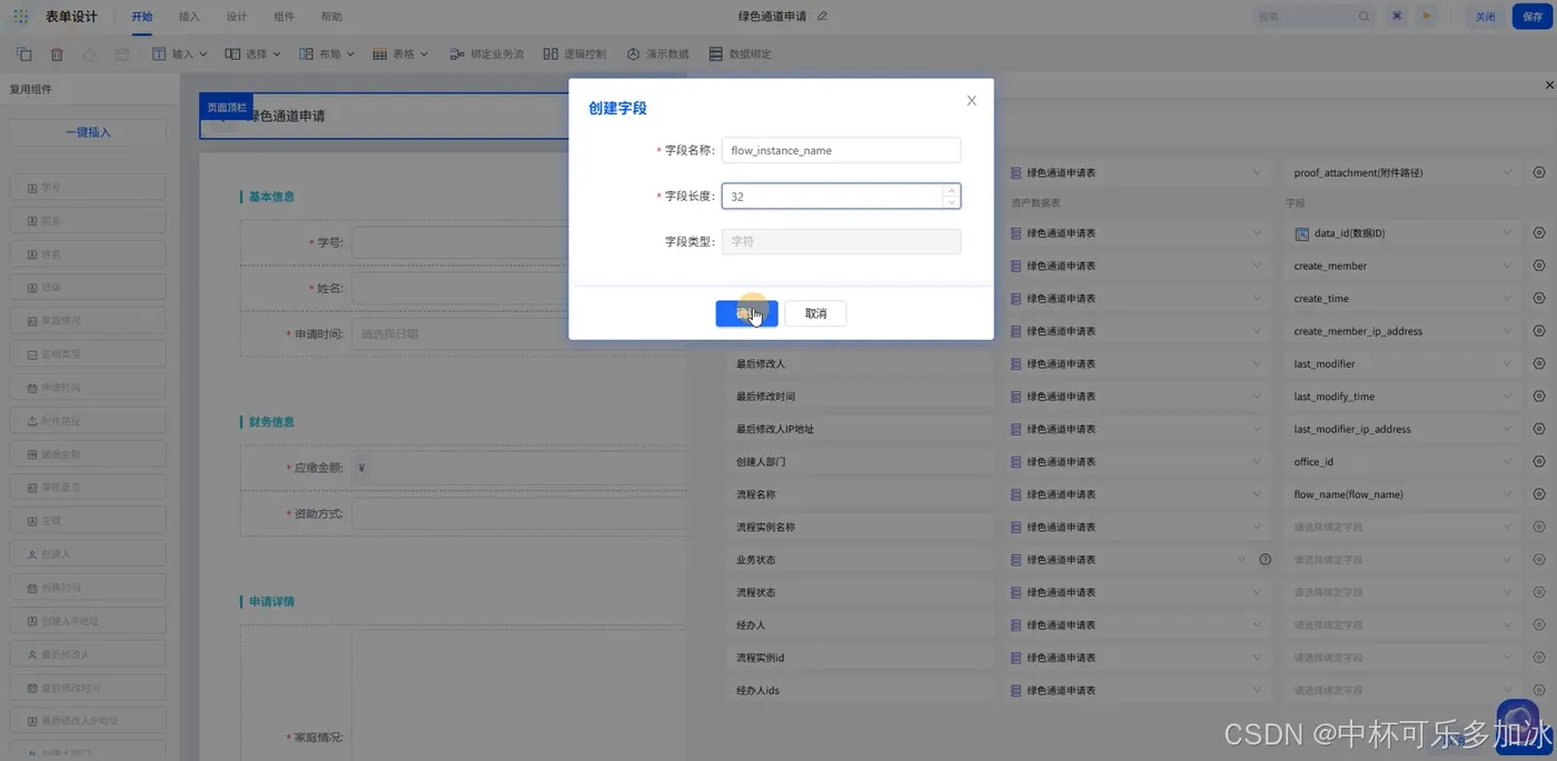 流程配置完成后,需绑定流程字段,系统能自动生成数据模型,配置时“一键添加流程必备字段”(如业务实例id、经办人等),字段调整实时同步数据库,无需编写 SQL。