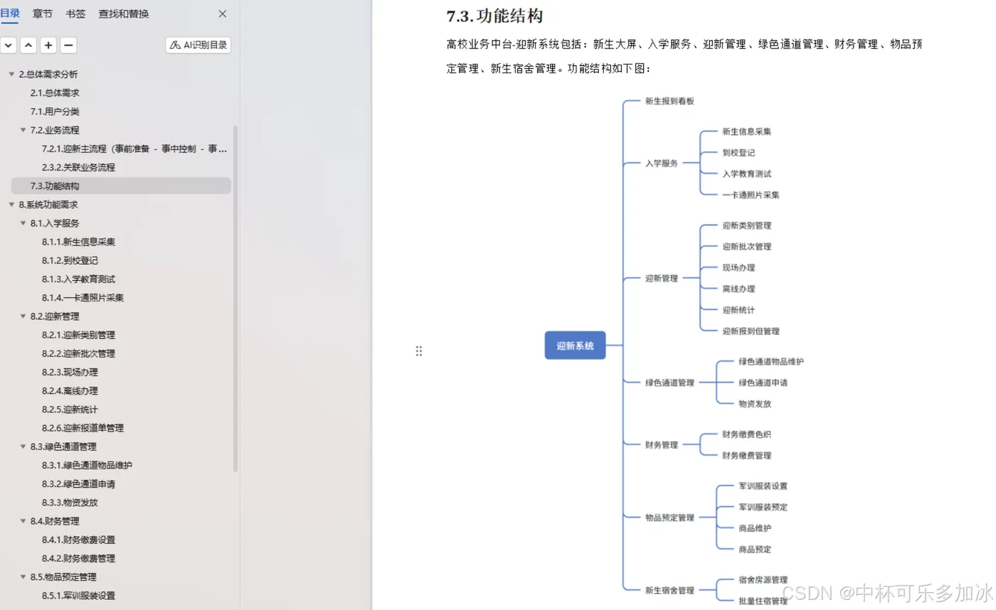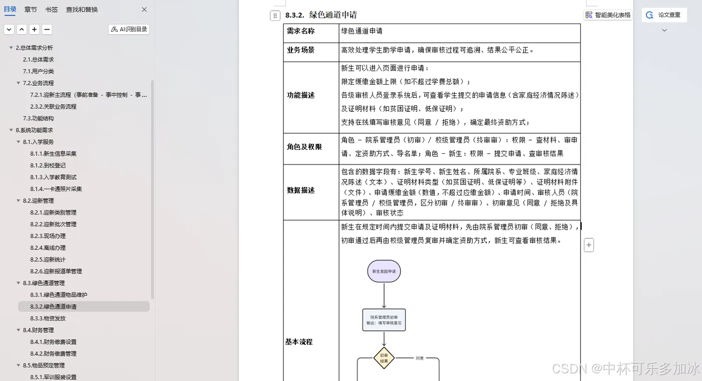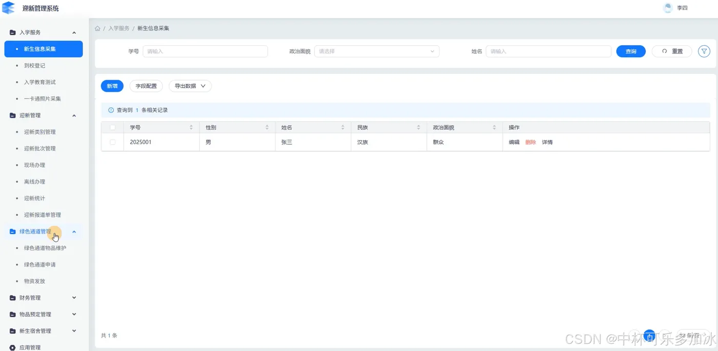生成结果中,新生信息采集、迎新管理、绿色通道管理等菜单及各菜单下的表单字段,均能精准匹配需求文档,不过尚未包含业务逻辑相关配置,需后续进一步完善。