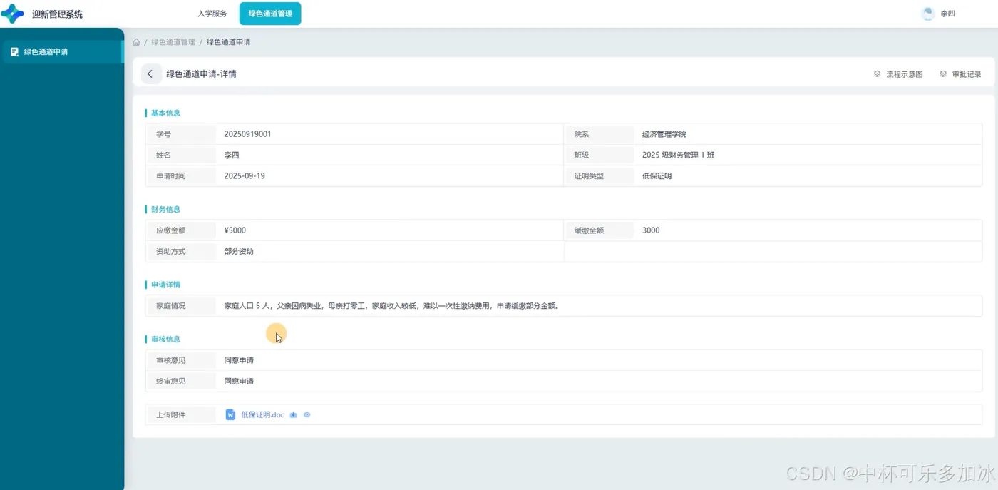 最后切回新生账号,刷新页面就能看到 “审核通过” 的状态,还能看到两级管理员的意见 —— 整个流程走下来很顺畅,没出现卡顿或权限错乱的问题,这时候系统就基本能用了。