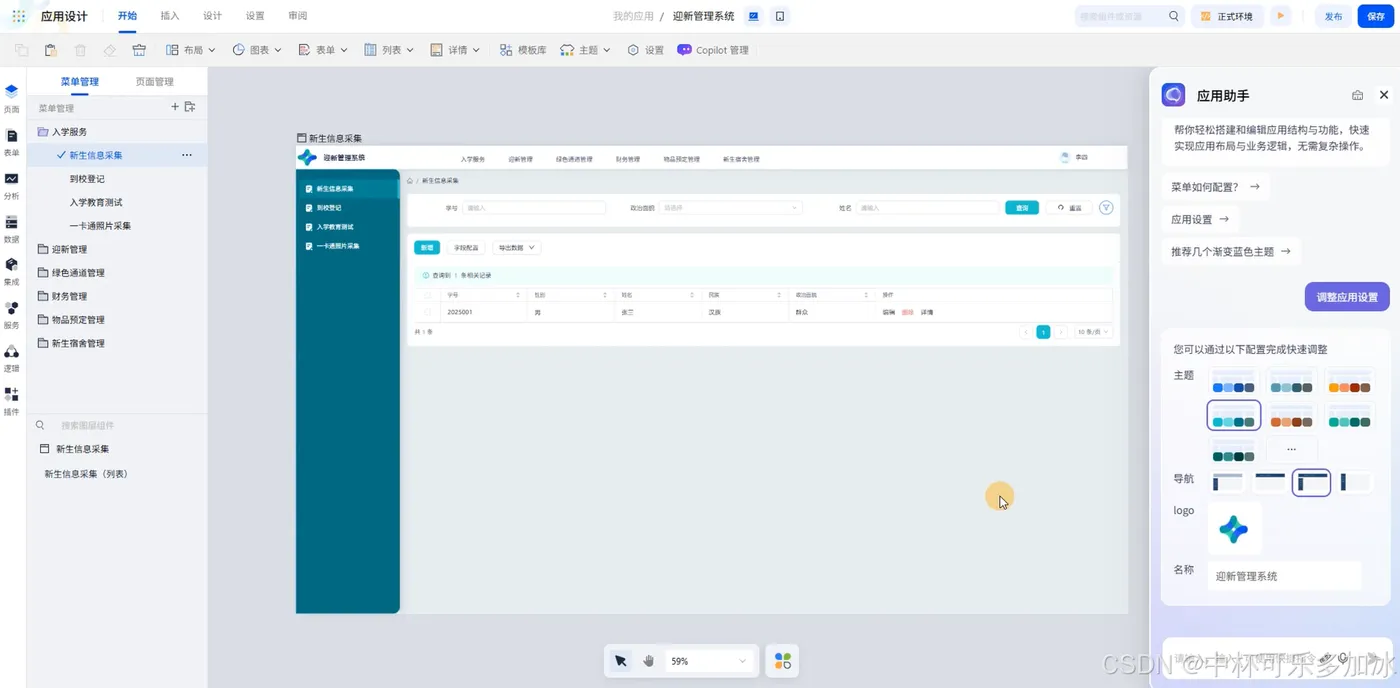 先调样式,高校迎新系统大多希望氛围清新,所以在助手输入框里敲 “调整应用设置”,会弹出主题、导航、logo 调整选项,直接调整,实时看到效果,不满意还能随时改。